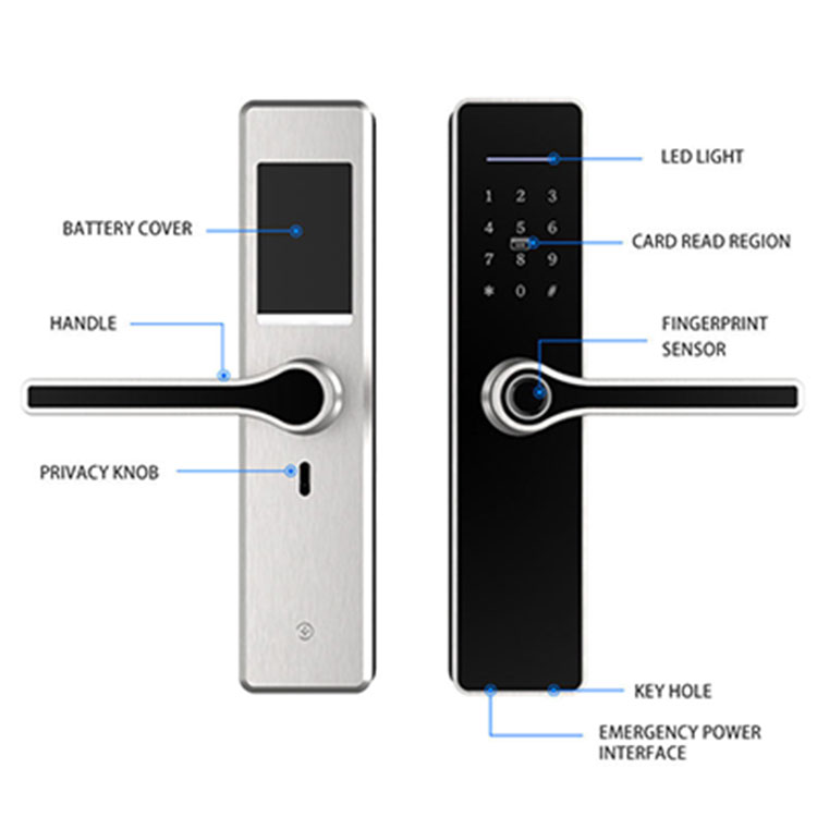 1. Accesso tramite app/impronta digitale/codice/scheda/chiave meccanica.2. Elevata sensibilità della scheda digitale touchscreen.3. Compatibile con il blocco TT o l'app Tuya.